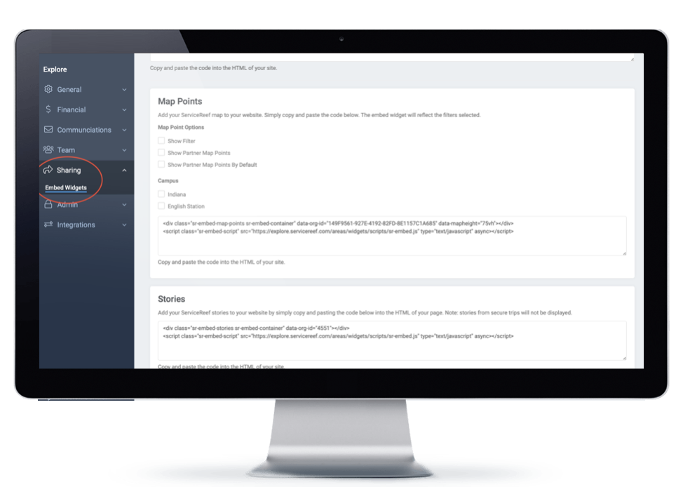 ServiceReef offers a series of embed widgets (ex: your trip list, your stories, and your map). Scroll down the page until you see the section for Map Points.
