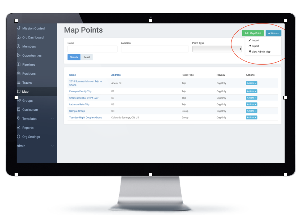 Note the search tool in the top right of the map page that allows you to search by map point type and also has the ability to display past map points (ex: previous mission trips) and secure map points (adding private map points that only admins can view).