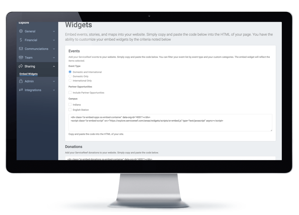 ServiceReef is designed to be a stand alone website for you or a resource to power your missional activity. If you have an organization or church website then we always recommend using our embed widgets to automatically post your opportunities and resources directly into your organization's website. ServiceReef offers embed widgets for the following:
