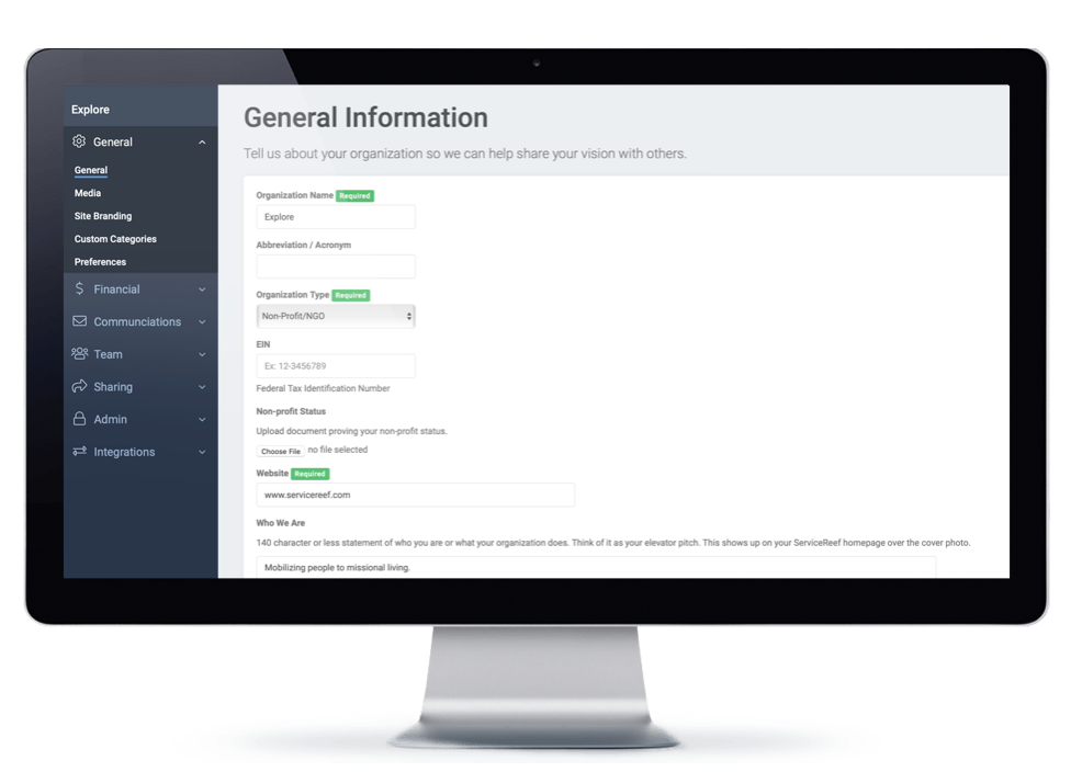 Every organization who creates an account on ServiceReef has an organization profile. Each profile sits at your subdomain (ex: yourchurchname.servicereef.com). Our desire is for you to make your subdomain and profile feel as much like home for you as possible. This quick start guide will walk you through some of the essentials to get things set. Remember, these are typically settings you will only configure once. Let's get started so you can get on your way to the more important things like mobilizing your audience to mission!