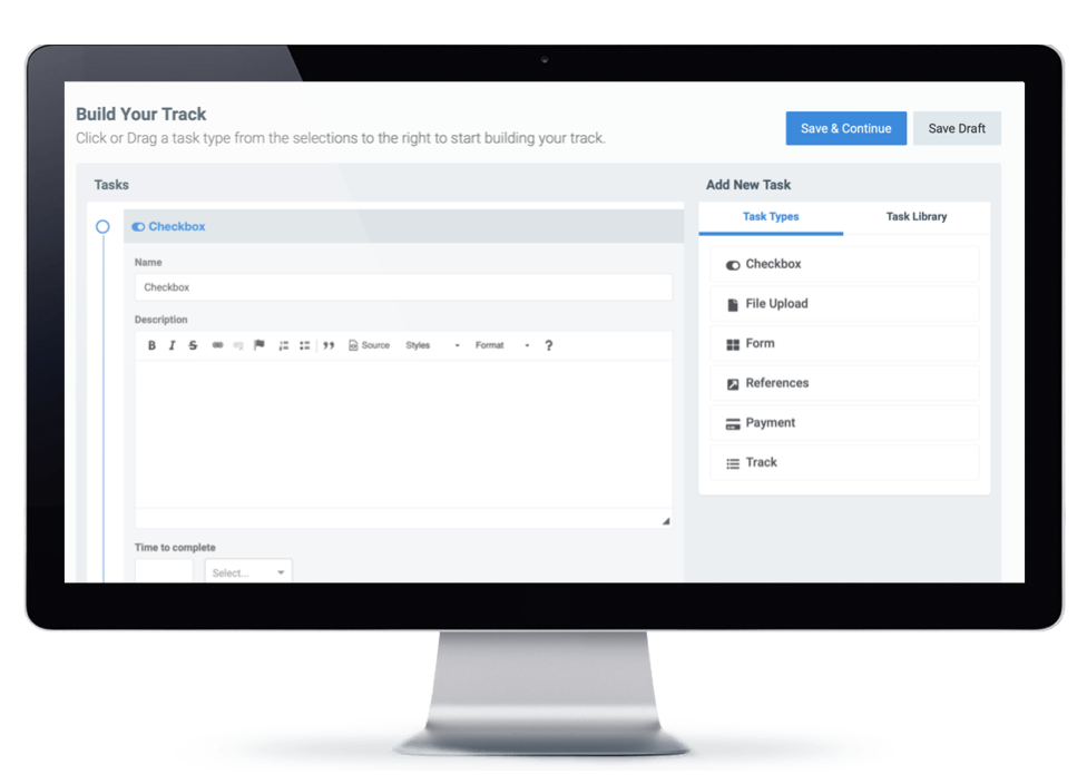 Now it's time to build the TASKS that make up your Track. ServiceReef provides a series of task types that allow for a highly customized Track. Let's explore these task types:
