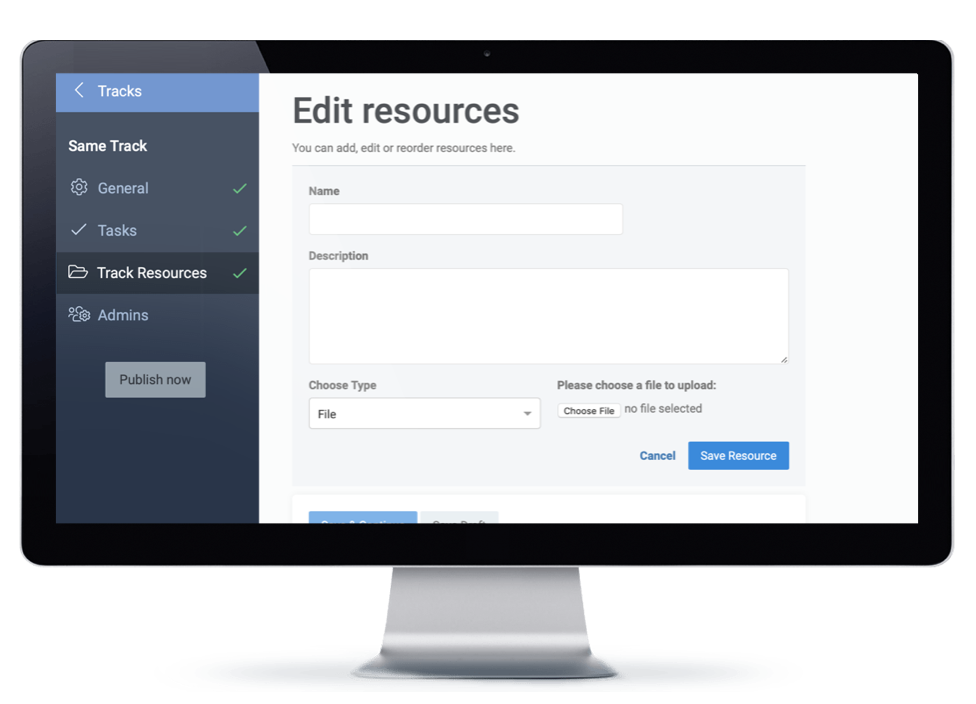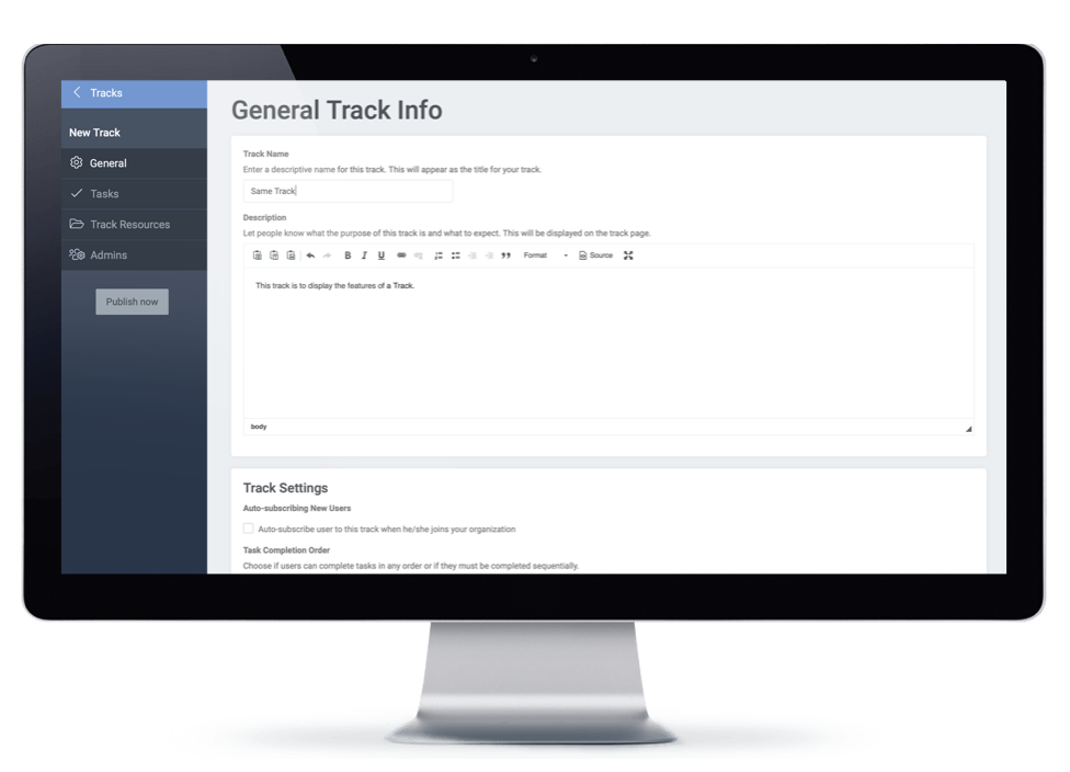 It's difficult to think up a Track plan when you're directly in the tool. We recommend you brainstorm your Tracks (and their tasks) on a white board first and then come in with that plan. You'll be far more efficient and excited about what you're doing if you start with a plan and how your organization is going to use this.